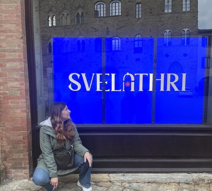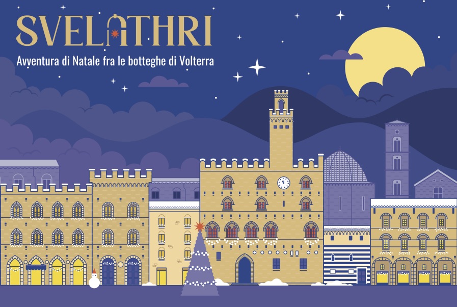 A livello fonosimbolico, infatti, Svelathri ripropone una camminata alla scoperta delle botteghe volterrane. La prima sillaba “Sve” scivola velocemente attraverso una delle tante porte d’ingresso, intravedendo una piccola luce (la /e/ fonema piccolo e luminoso), sarà la stessa riproposta da Valeria nel logo dell’evento? Quella lucina dell’albero di Natale che illumina piazza dei Priori? Ma non abbiamo tempo per farci domande, perché la seconda sillaba “La” ci accompagna dolcemente su una piazza spaziosa da ammirare a bocca aperta come la sua vocale. Dopo averla attraversata è il momento di immergersi con la sillaba finale “Thri” fra le tante vie del borgo, costellate di torri, campanili, vetrine e usci luminosi tutti da scoprire.