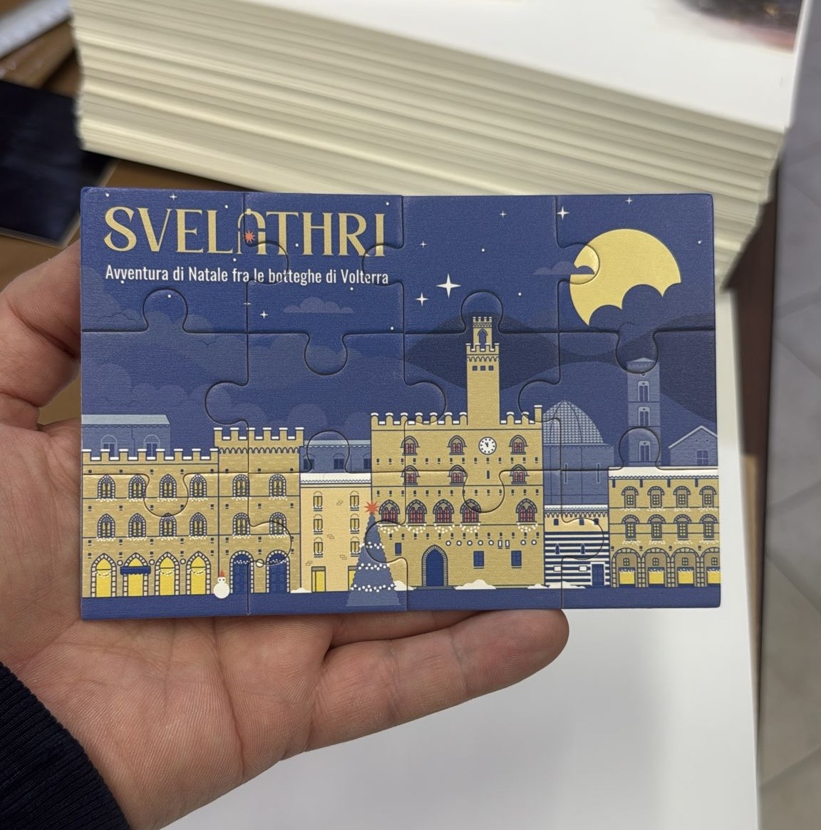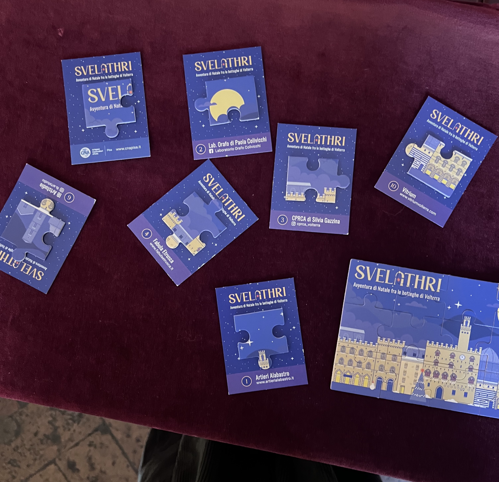 A livello semantico, infatti, questo nome, oltre ad essere altamente specifico per il borgo di Volterra, è in linea con l’attività proposta e il periodo natalizio, perché evoca lo svelare Volterra, le botteghe e i loro segreti, come fossero caselline di un calendario dell’Avvento, ma anche lo svelare il puzzle e il regalo finale, una delle attività più iconiche del Natale.