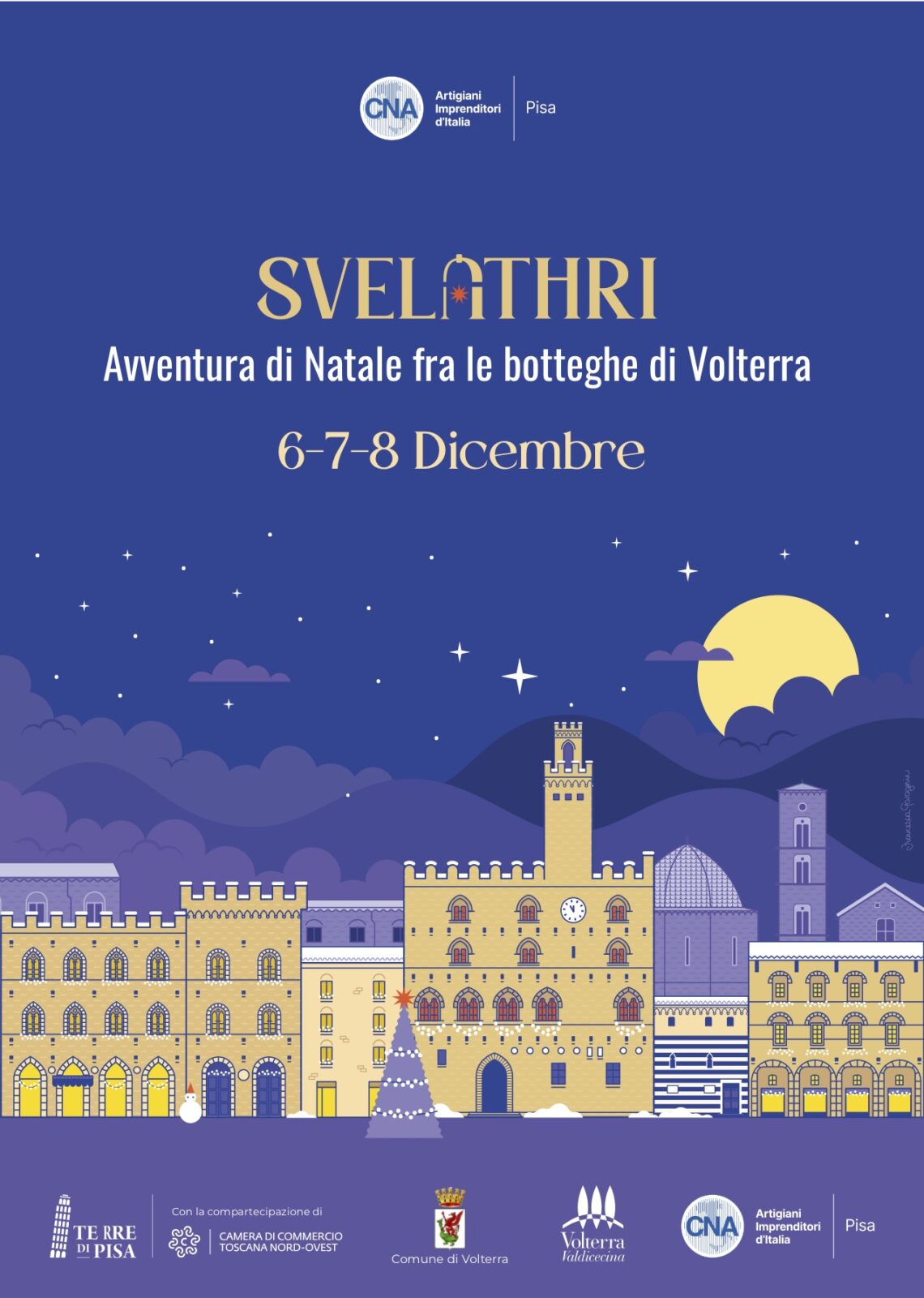 Trentuno luglio, ricevo un vocale dalla mia amica art director Valeria Plasmati. Sta organizzando la direzione artistica della prima edizione di un evento di Natale a Volterra, per conto di CNA Pisa. Obiettivi, modalità, format, tutto è abbastanza chiaro e condiviso. Quello che manca è un nome, il nome dell’evento. Valeria mi voleva nel team creativo insieme a lei e all’illustratrice Francesca Gavagnin.